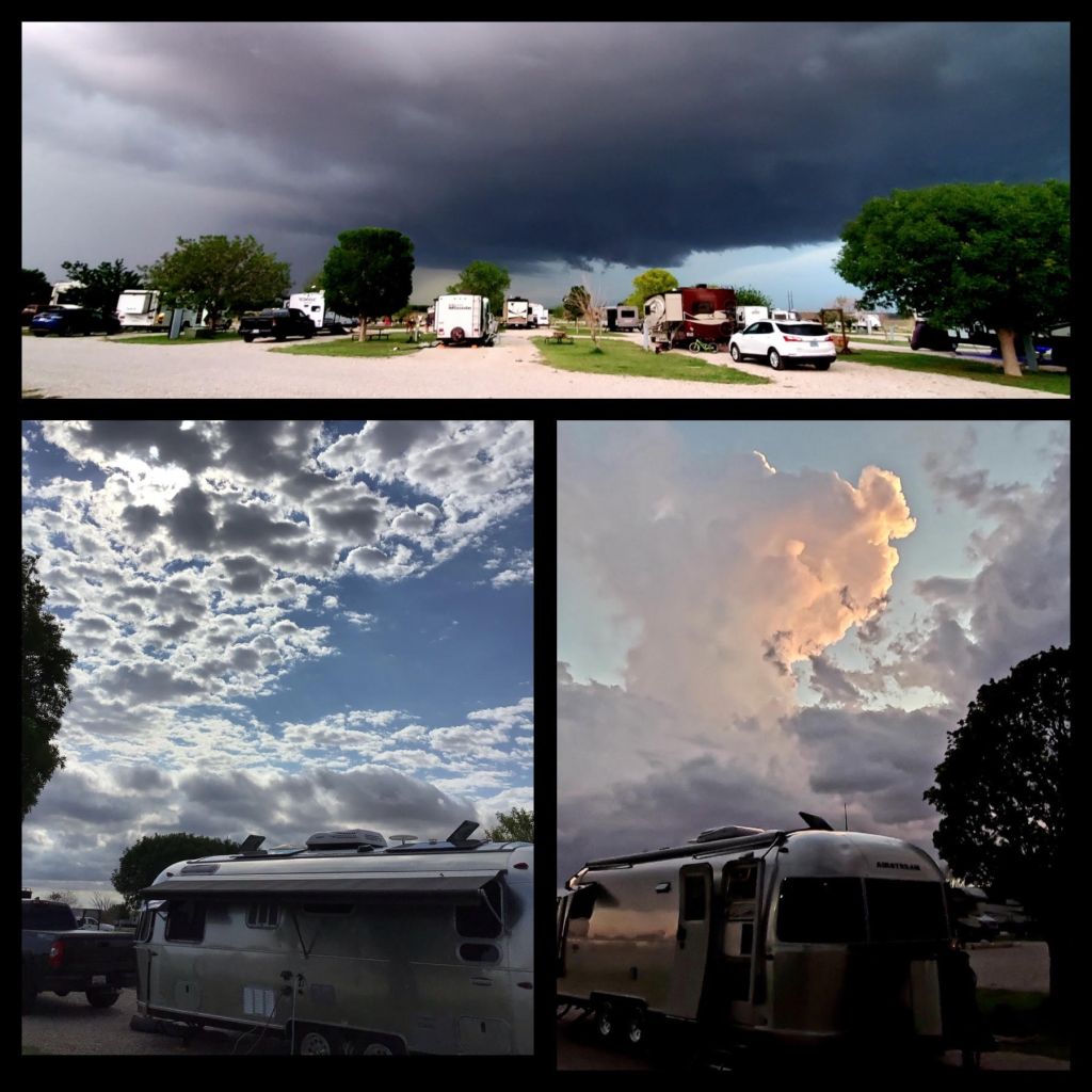 Ugghhh…this crazy New Mexico weather! One minute it’s 90 degrees and you are thinking about taking a dip in the pool to cool off, the next some giant thunder/lightening/hail storm comes rolling in! Strong winds that whip up at a moments notice help to keep you guessing what’s next. On Saturday I was making sausage/egg biscuit sandwiches for dinner (as mentioned above, I was mourning!) and the sunny sky started turning black and then we were hearing these loud booms. The booms were coming over and over and we went out to investigate. A campground ranger was coming by and explained that the large pecan farm next to the campground had weather canons that fired bursts of air into the atmosphere in an attempt to break up the storm clouds. This went on for hours, but must have worked, because the worst of it passed by us and we later heard tornados were spotted just 50 miles from us, south of Roswell. The other thing about these storms is that the rain is SALTY, like super salty! Our truck is covered in white salt. Joel and I spent hours washing it off on Sunday and guess what? Yup, covered in salt again. We are leaving tomorrow morning. :-)