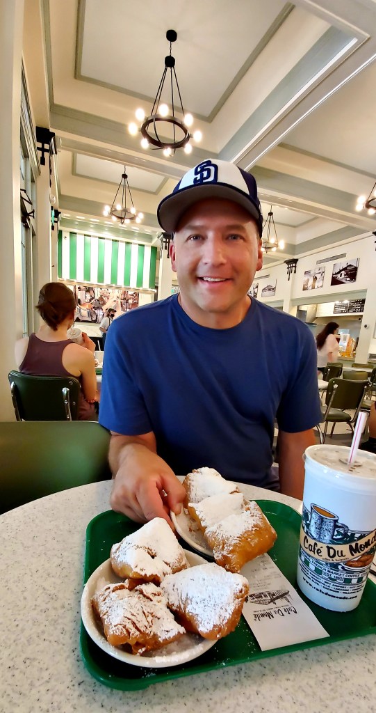 We’re here! Yes, one of our favorite spots is New Orleans, so much to see and do. First, we went into the French Quarter and did the touristy-thing mostly walking around and taking in the sights. We stopped into Café Fleur De Lis for breakfast and I tried the seafood eggs benedict. They used a crab/shrimp cake instead of an english muffin and topped it with a poached egg and hollandaise sauce and it was delicious. Joel had banana praline pancakes with caramelized bacon and a shot of Kentucky bourbon – boy that will wake you up! New Orleans has the best food😘.
