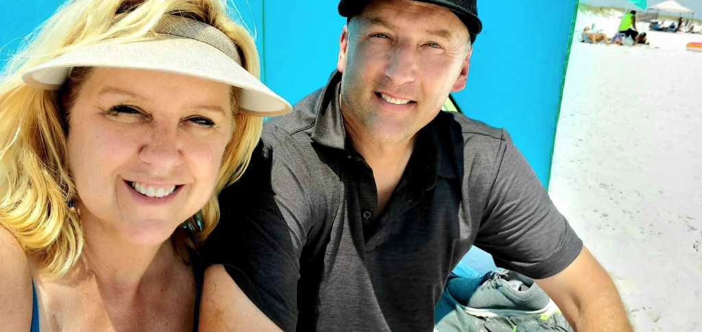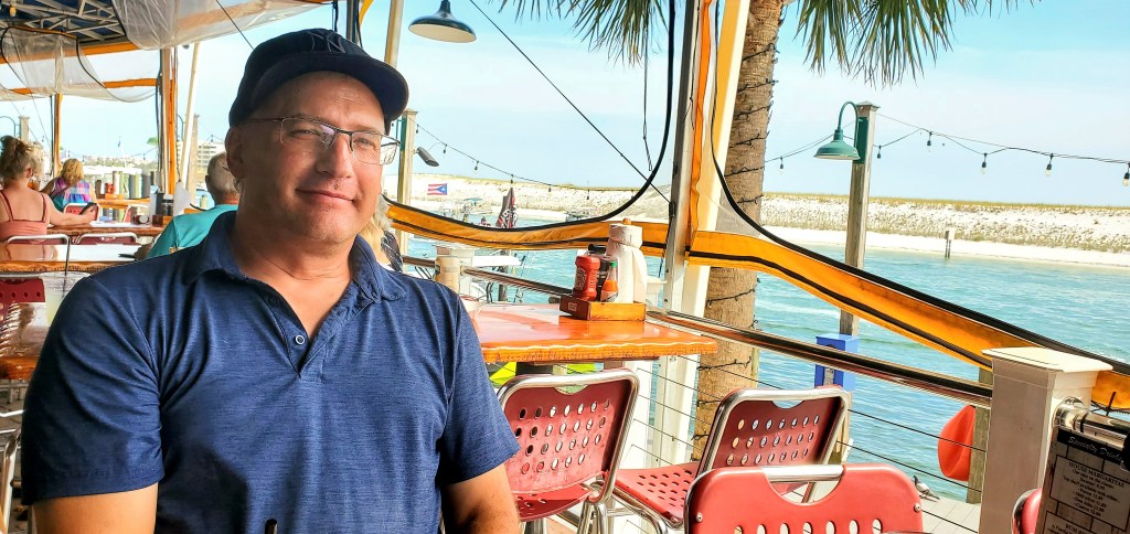 We headed 20 minutes down the road from our campsite in Navarre to Destin, FL. It is a happening beach town, packed with tourists and boats. There was so much going on – – you could parasail, bungy jump, rent a boat, go sportfishing, shopping, carnival rides, or throw an ax! It was fun and exciting to be around so much activity, everyone having a good time, it felt like normal life again. We walked up and down the boardwalk taking in all the activity and trying to figure out which restaurant to dine in, they all looked so good! We ended up at Harry T’s Lighthouse and it was definitely the best choice. Where else can you find fresh crab cakes served atop a fried green tomato (which were actually yellow as you can see in the pic), topped with a slightly spicy remoulade sauce. My mouth is watering just thinking about it. Joel said his grilled chicken stack sandwich was the best he has ever eaten. We shared an appetizer of hush puppies (a fried sweet onion dough ball), a Southern staple that Joel has never tried before – he liked them!