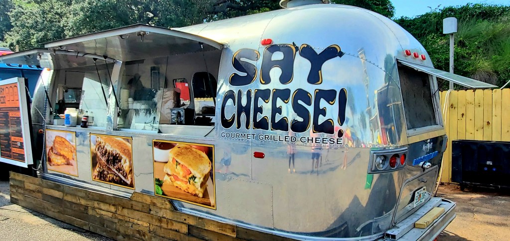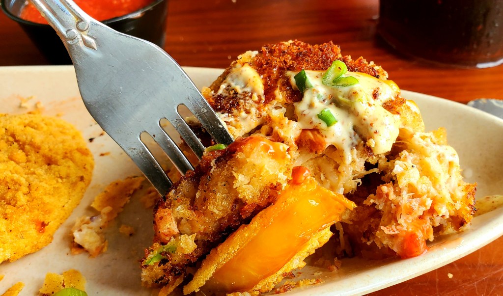 Gulf front diningCool Airstream Grilled Cheese SpotCrab cake served atop a fried green tomato