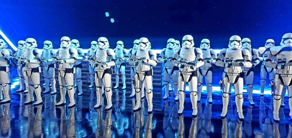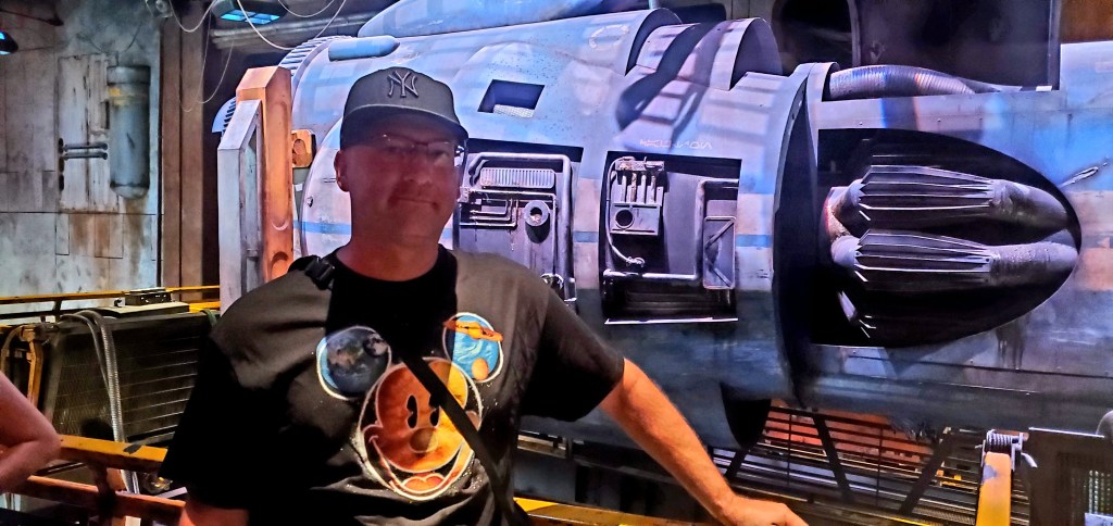 We are super excited to be visiting Star Wars land at Disney Hollywood Studios. Luckily, we were able to win a lottery of sorts to go on the best ride EVER – – Rise of the Resistance. It was so fun and unlike any other ride we have been on. The above pic are storm troopers that took our group of resistance fighters captive, they have live action actors that interact with you and you are thrown in prison, escape, board a star fighter and crash land. It’s hard to describe all the action and you are sometimes standing, sometimes being herded through an escape hole lasered into the wall, all sorts of craziness. When we got off this ride a real storm had just rolled in and it was pouring rain, thunder and lightening which somehow made our crash landing a little more realistic.