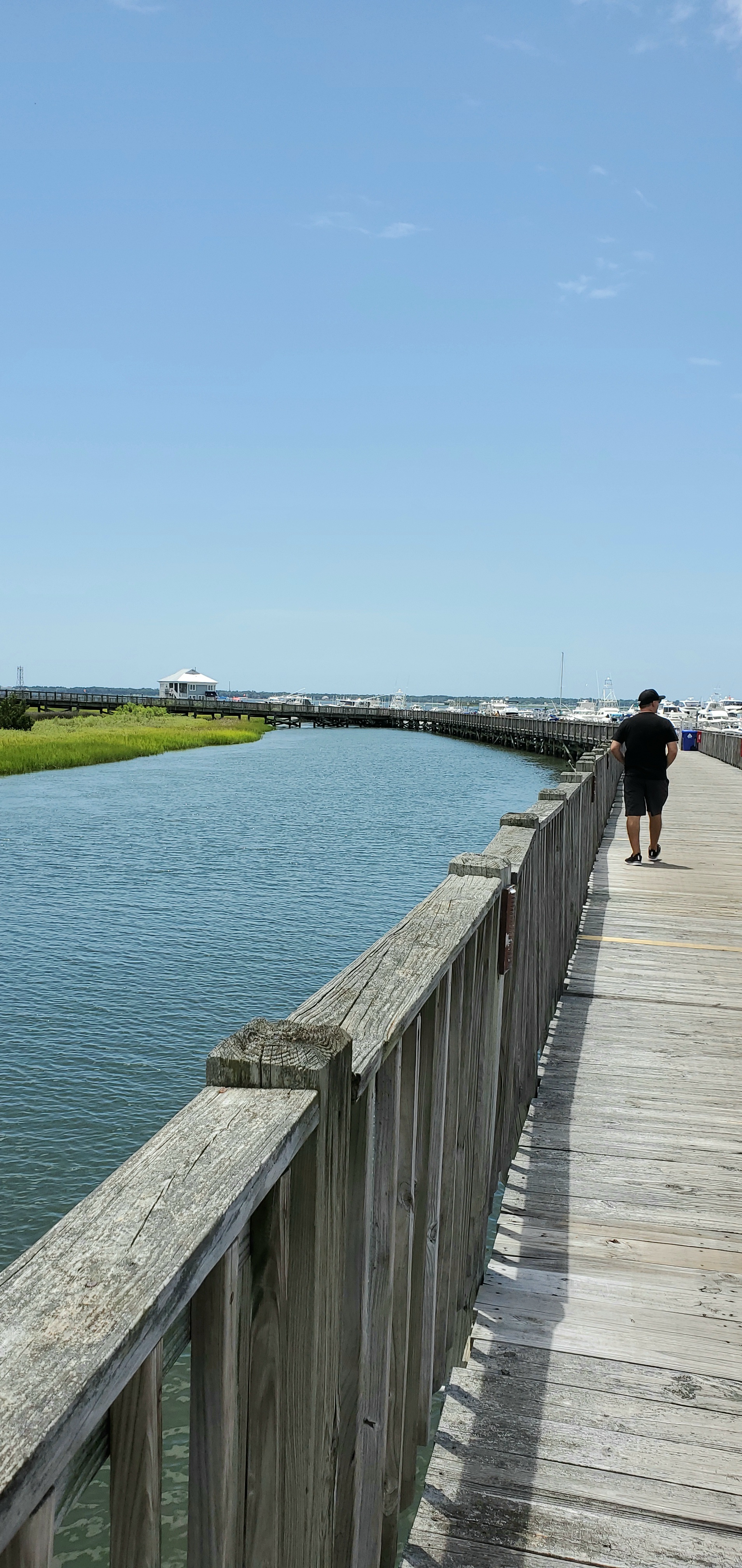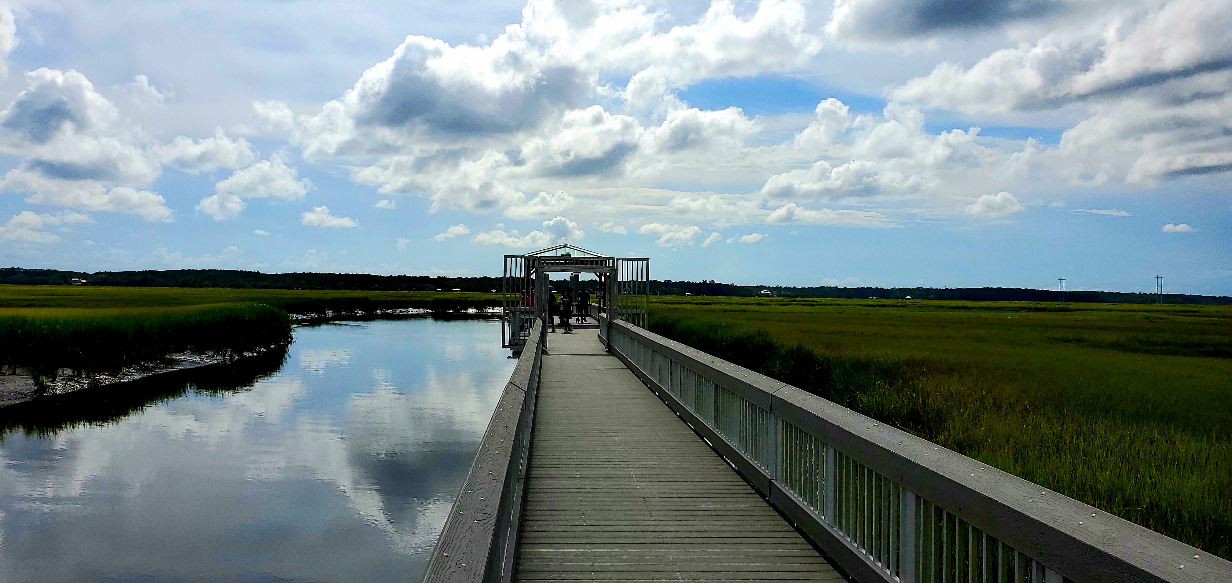 We stayed at a State Park on James Island. It is a HUGE park with miles of paved trails that wind in and out of forests, play ground areas, a story land, a water park, game fields and the RV park. It was fun to ride our scooters and easy to get lost with all the crisscrossing paths. At one point we found ourselves at a long dock with a water inlet from Charleston Bay. While we were hanging out on the dock a small pod of dolphins ventured their way down the inlet to feed. They were so graceful as they glided through the water leaping up for air so we could enjoy the show.