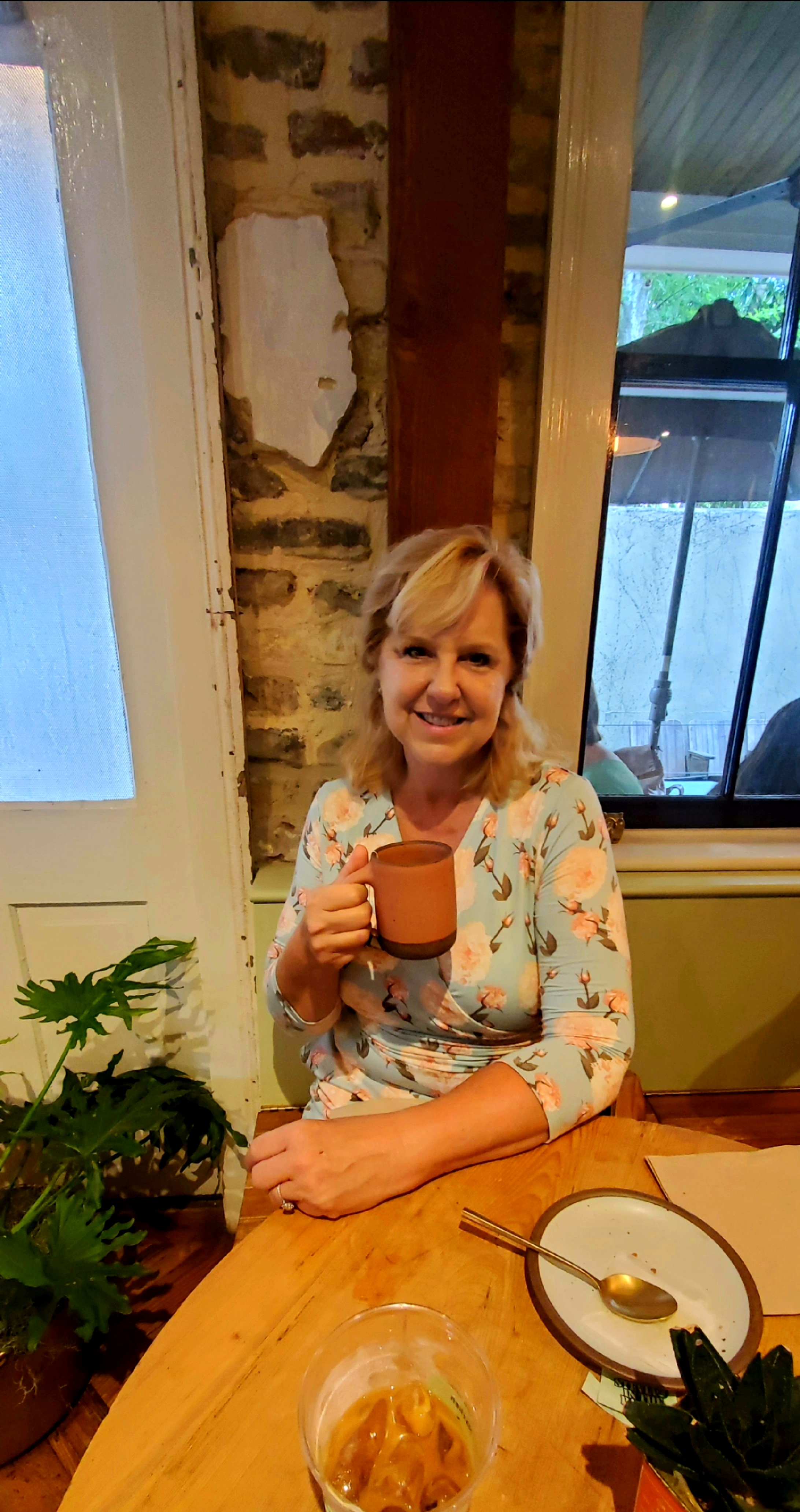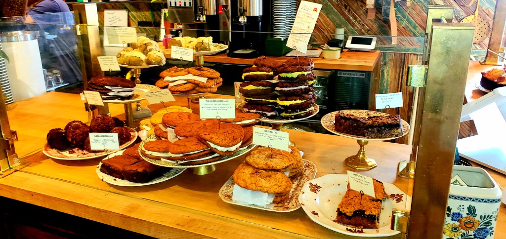Our first stop was Copper Kettle Café, a cozy, dog-friendly spot that instantly won us (and our pups) over. Joel dove into their buffalo chicken flatbread wrap, and it looked so good even Lou Lou couldn’t resist trying to swipe the orchid garnish right off his plate. (Yes, she’s wild like that. No orchid was harmed—just mildly slobbered on.)