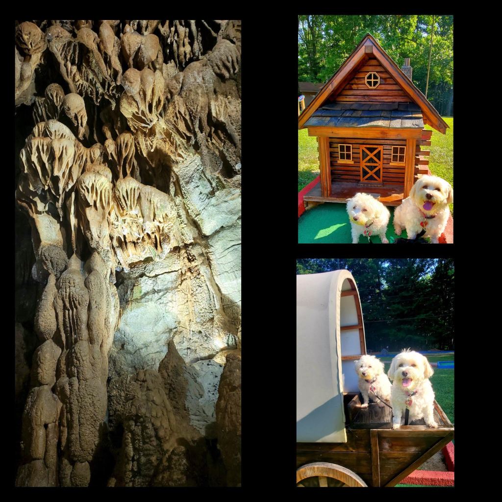 The campground had so many activities – – swimming, horseback riding, hiking, cave tours, kayaking, and this super cute miniature put-put golf course. The props for the golf course included a perfect doggie-sized covered wagon, log home, a little trailer, etc., so I made the pups pose (they were less than thrilled about this). Also, I cannot forget to mention there were FIREFLIES!!! Yes, real fireflies that would spring up from the ground and light up as they shot up into the air. It was the coolest thing ever to watch. It made the forest look enchanted with firefly lights blinking on and off throughout the woods.