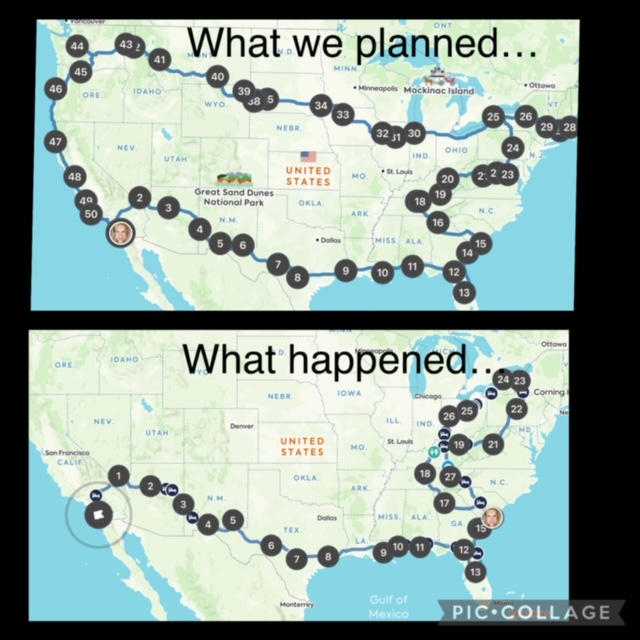 Hello, it’s been a while! People are starting to reach out and ask where we’ve been. Our Airstream journey was planned as a six-month round trip per the first map above. Well….things didn’t go exactly as planned (understatement of the year!). The first problem came up when we hit an unexpected hail storm in New Mexico that did quite a bit of damage to our roof. But we soldiered on, it was more cosmetic than structural. Fast forward from stop number 4 to stop number 10 (Savannah, GA) and we ran into a tropical storm that destroyed our awning. That sucked. But again, we soldiered on as originally planned all the way to Niagara Falls, NY. This is where things started to go off the rails as far as planning.